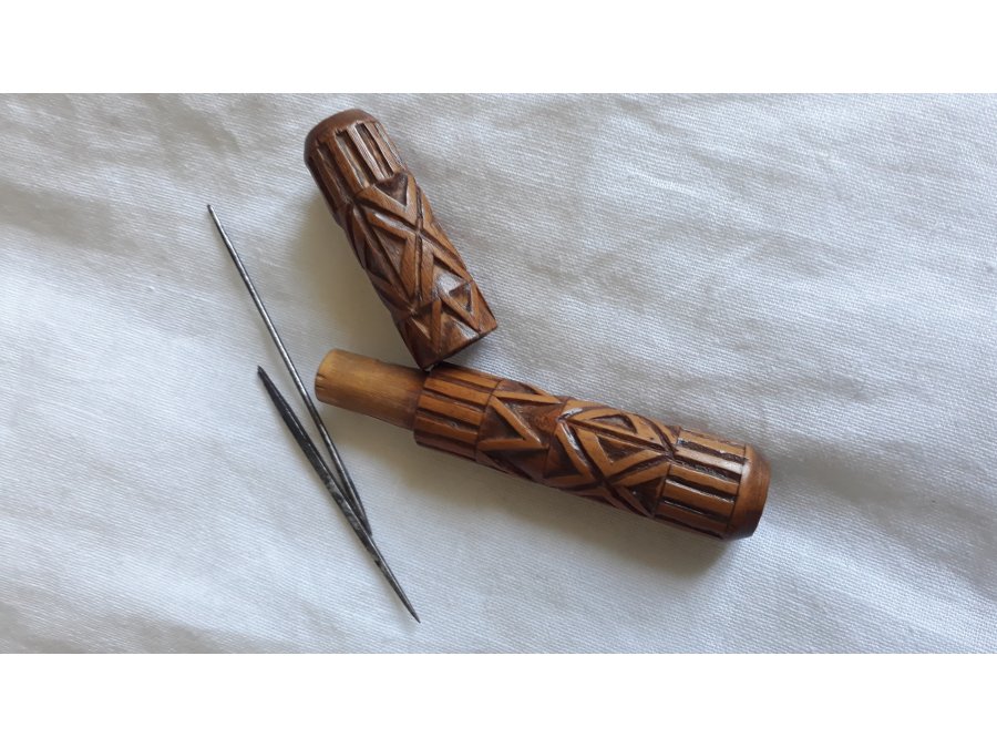 Etui de dentellière contenant une aiguille et un poinçon pour le travail de la dentelle.