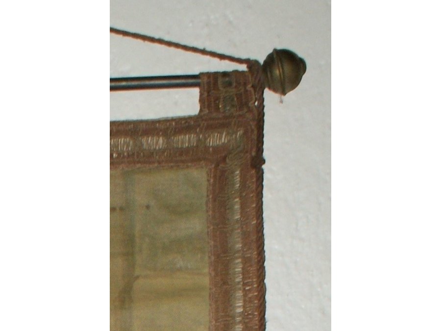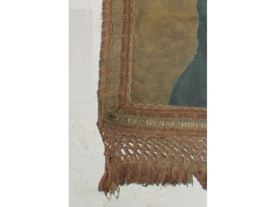 Il s'agit ici d'une toile imprimée ou peinte suspendue sur une barre en métal par des cordelettes, les bords de la bannière sont garnis de galons.