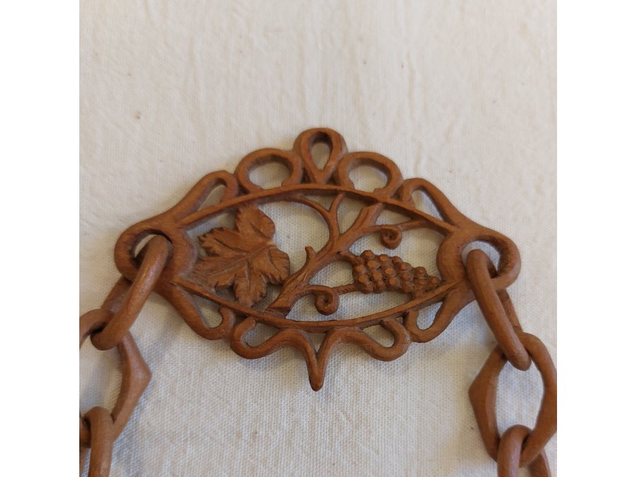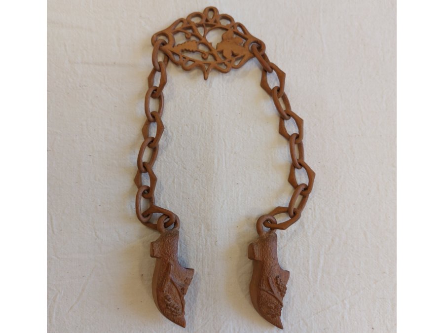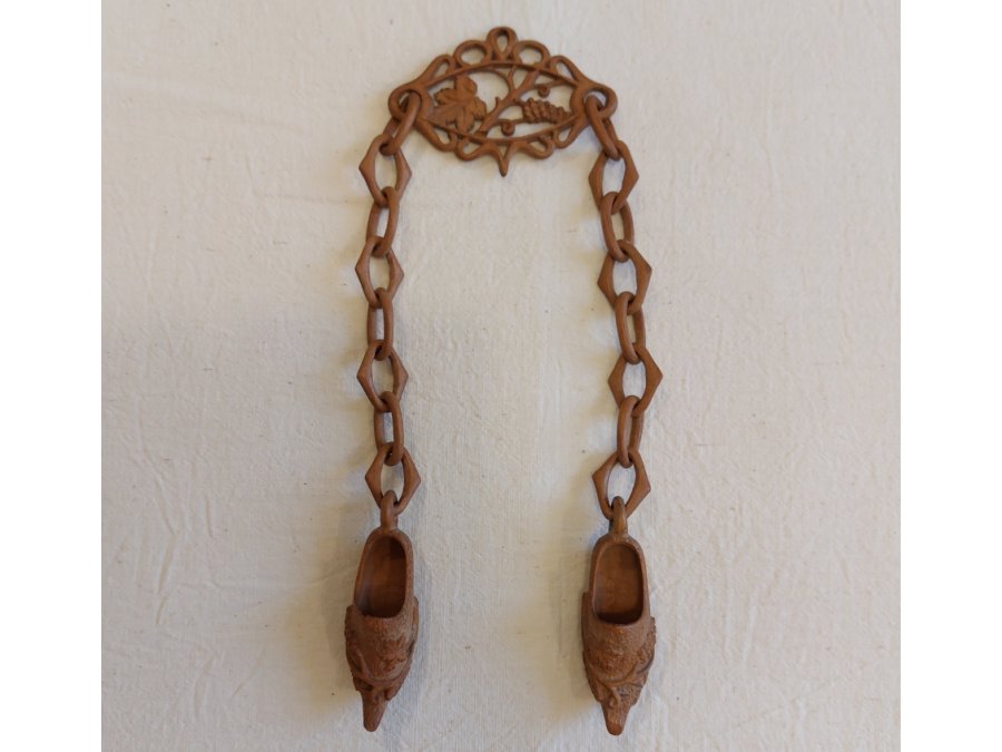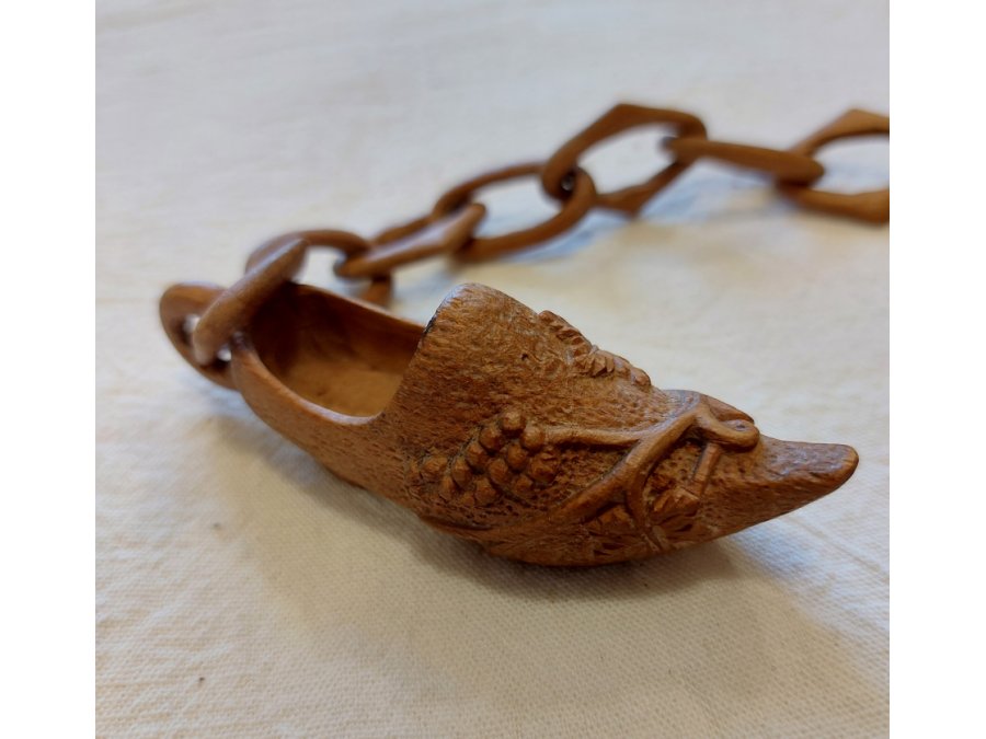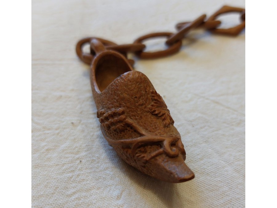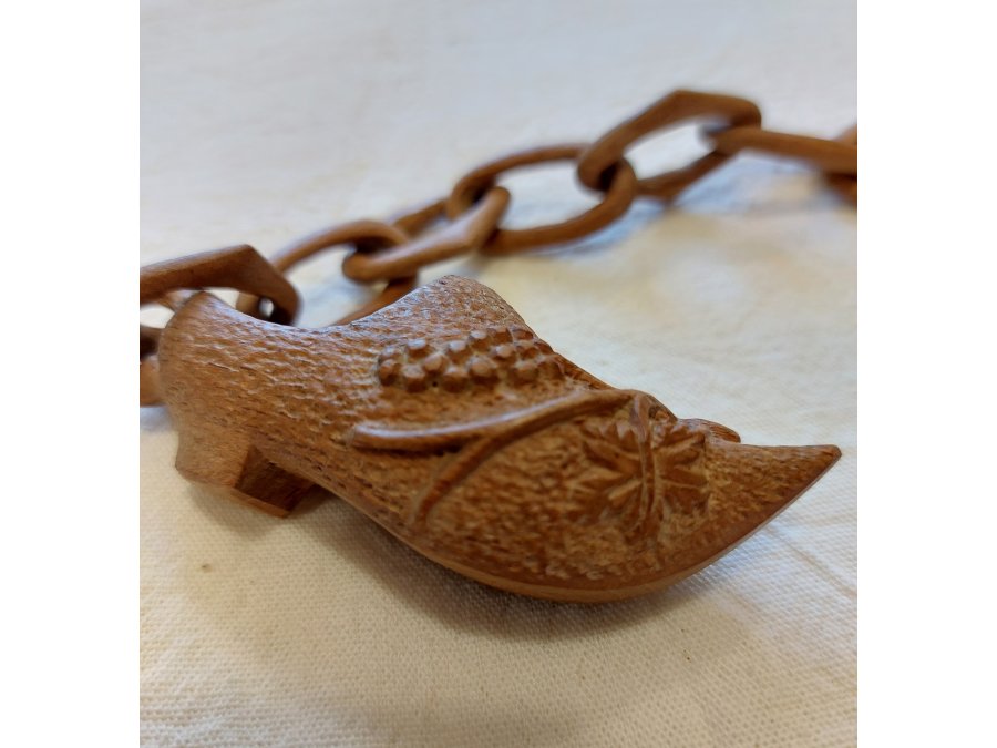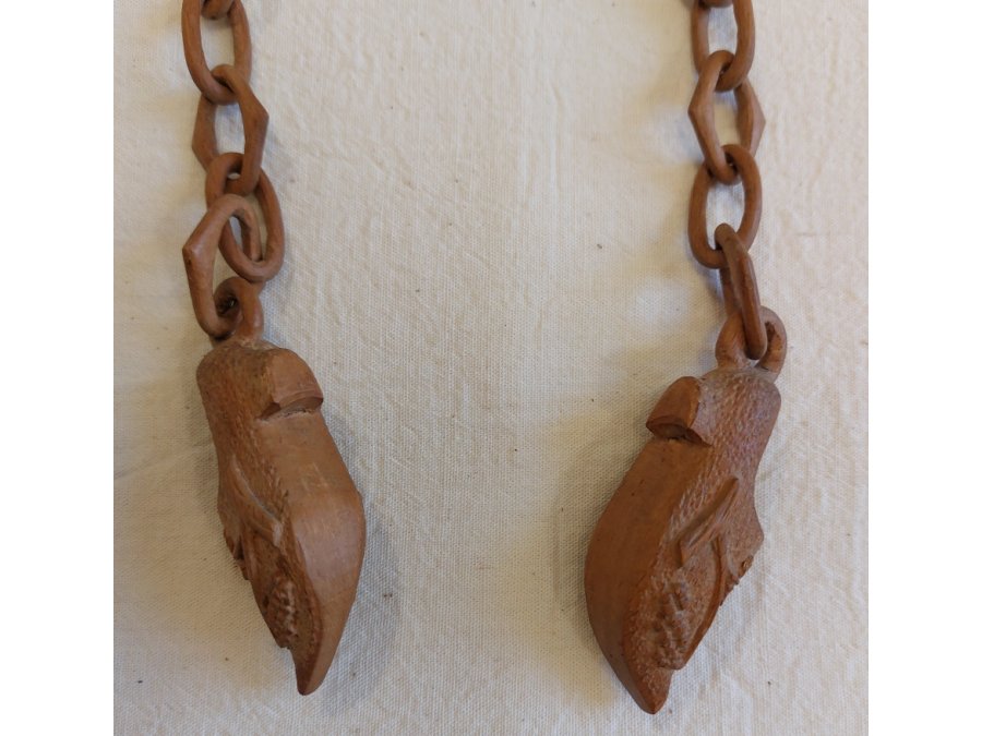 Travail en bois monoxyle d'une paire de sabots, l'un étant relié à l'autre par une chaîne.