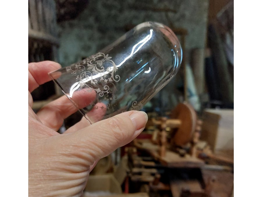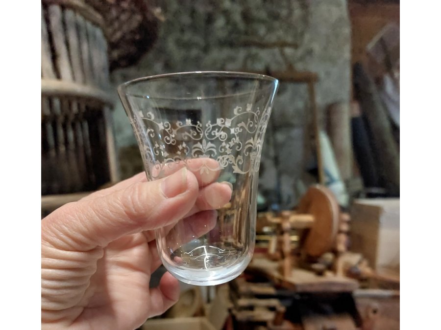 Petit verre gravé au fond arrondi, dit "cul sec" car il ne pouvait être posé avant d'être vidé...