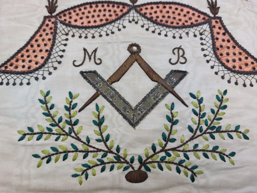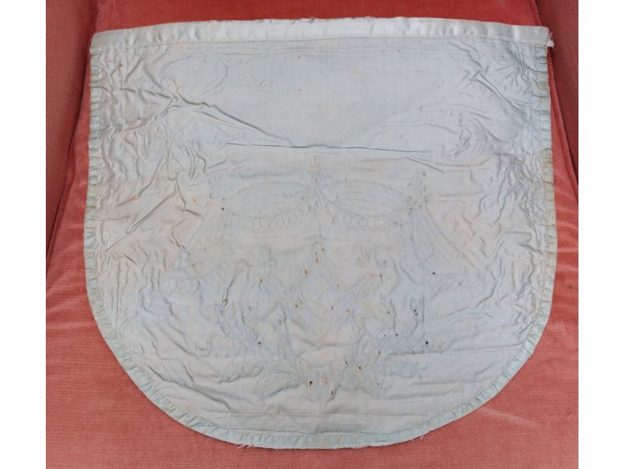 Tablier de maître maçon XIXème en soie ou satin brodé et bordé d'un ruban bleu.