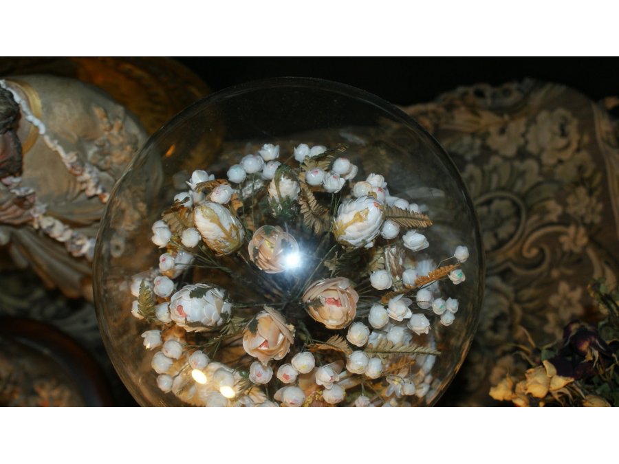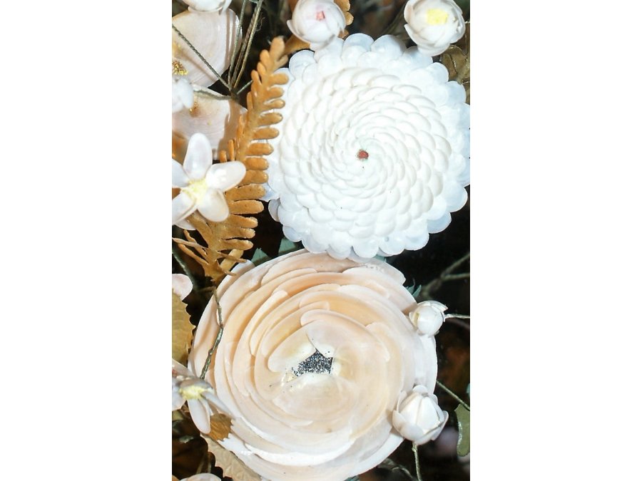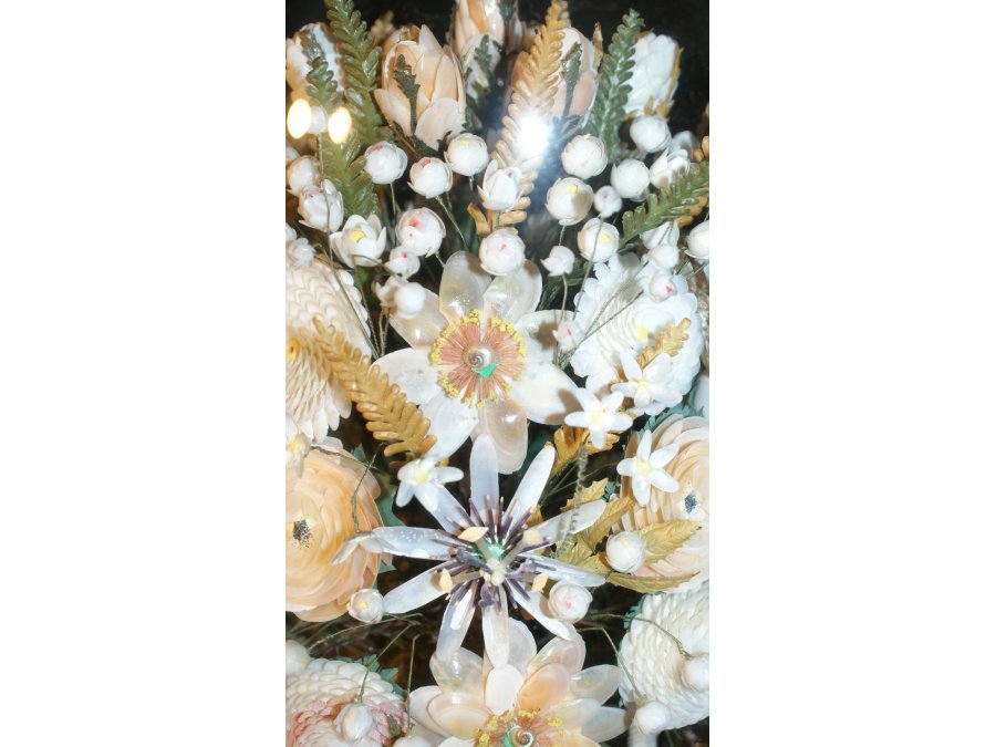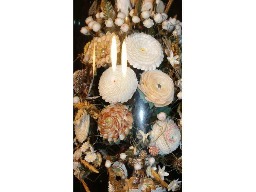 Sous globes Napoléon III d'origine, ces bouquets sont constitués de fleurs entièrement réalisées en coquillages. Chaque fleur est constituée de centaines de coquillages soigneusement triés en fonction de leur couleur, de leur forme et de leur taille afin d'assembler pétales et pistils. Ils sont présentés dans des vases de forme Médicis en bois recouverts d'une mosaïque d'éclats de coquillages. Ils reposent sur un support constitué de débris de coquillages et de petits coraux.