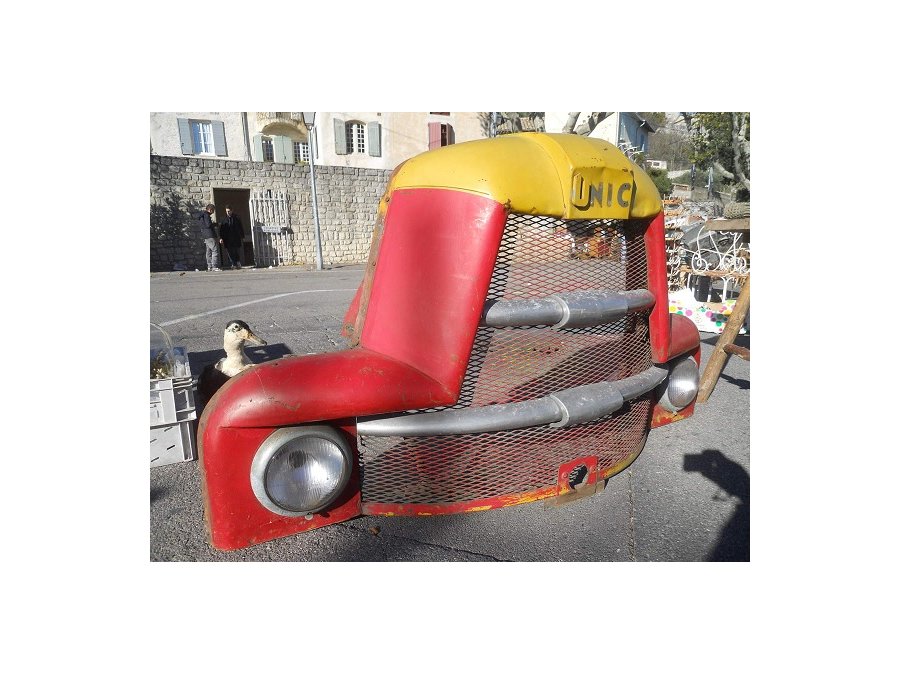 Calandre de camion des années 50 de couleur jaune et rouge, 2 phares.