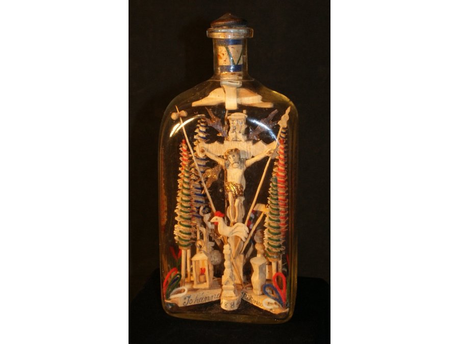 Cette bouteille de la passion dite aussi bouteille calvaire est fermée intérieurement par une clavette, elle est datée de 1884.