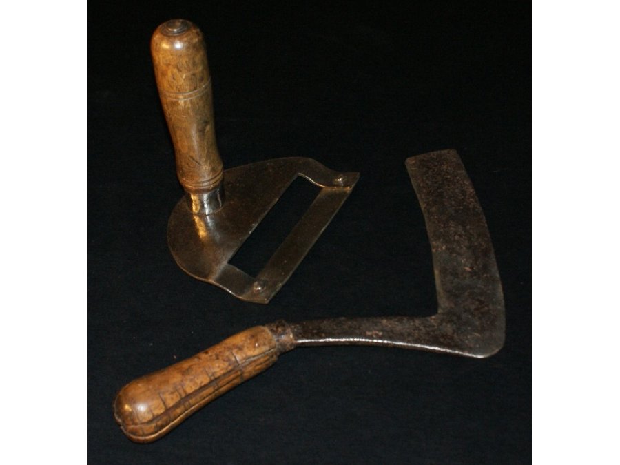 Le couteau à pain et le rabot sont composés d'un manche en bois et d'une partie tranchante en fer forgé.