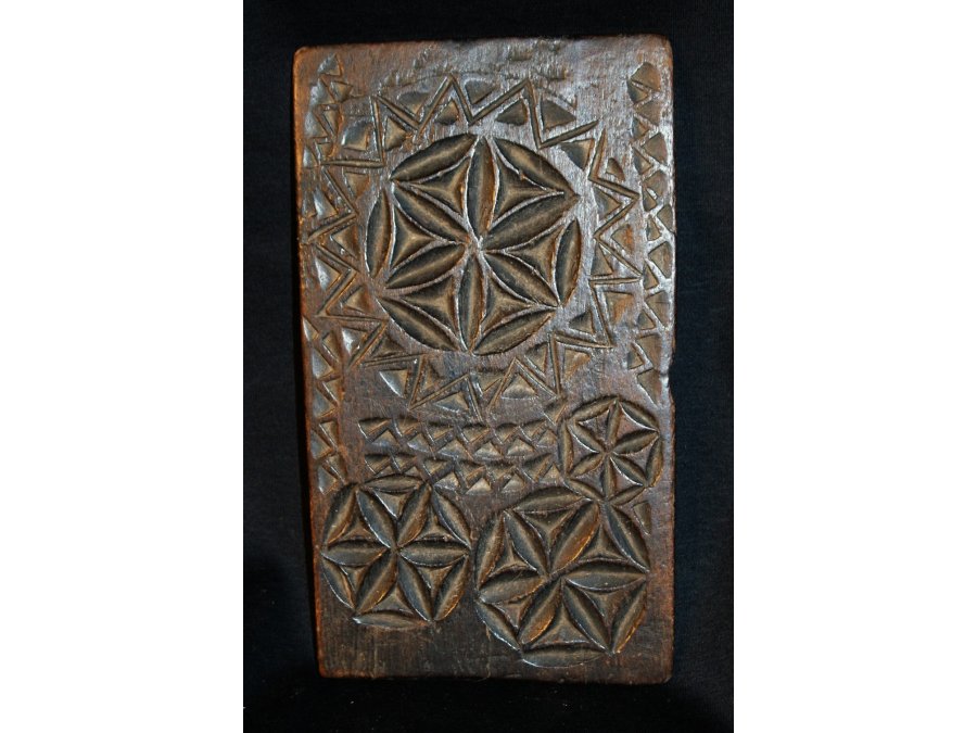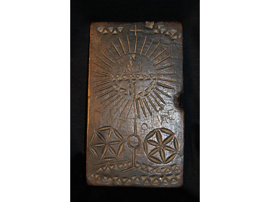 Ce plioir, probablement XVIIIème est sculpté de rosaces à 6 pétales, de dents de loup et d'un ostensoir.