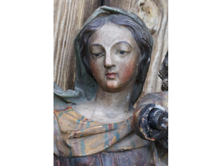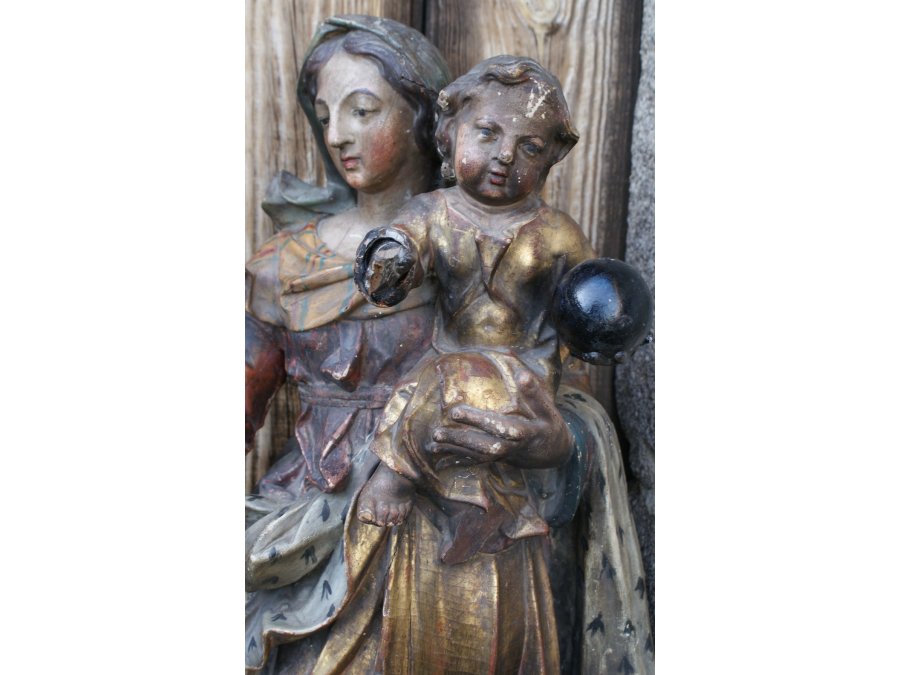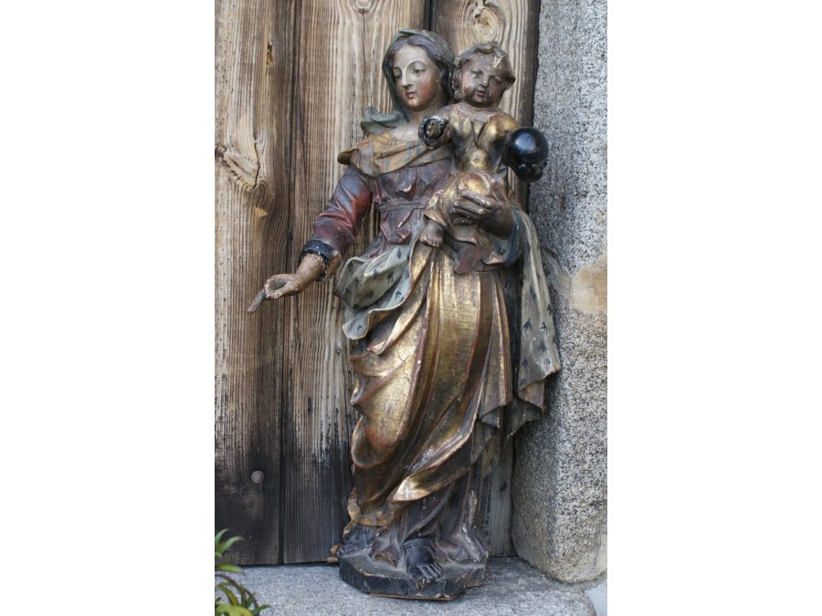 L'enfant Jésus, à la chevelure bouclée, qu'elle porte sur son bras gauche, présente le globe terrestre dans sa main.